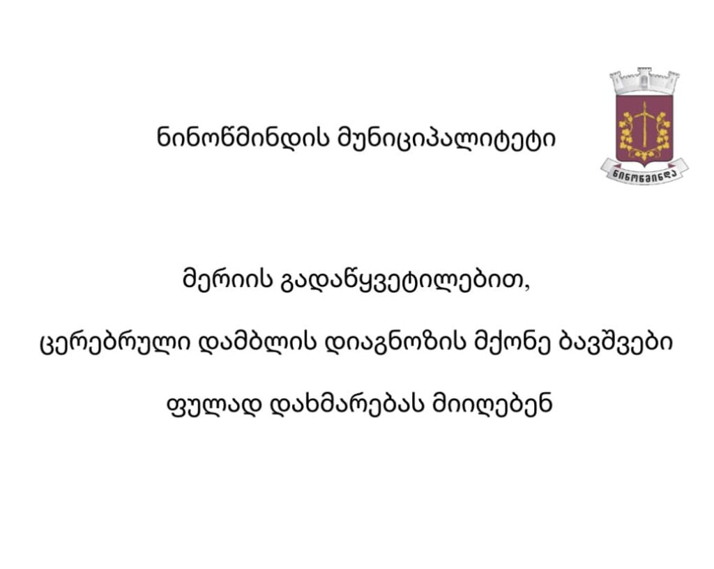 Նինոծմինդայի մունիցիպալիտետի քաղաքապետարանի որոշմամբ՝ Նինոծմինդայի մունիցիպալիտետի տարածքում գրանցված ու ապրող մանկական ուղեղային կաթված ունեցող երեխաները կստանան 500 լարիի չափով միանվագ դրամական օգնություն։